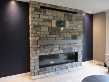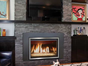 Omaha homeowners updated their living room to feature a Kozy Heat Callaway 72 linear gas fireplace complete with Antiquity Carbon Kingston natural stone and a Magra Hearth mantel.