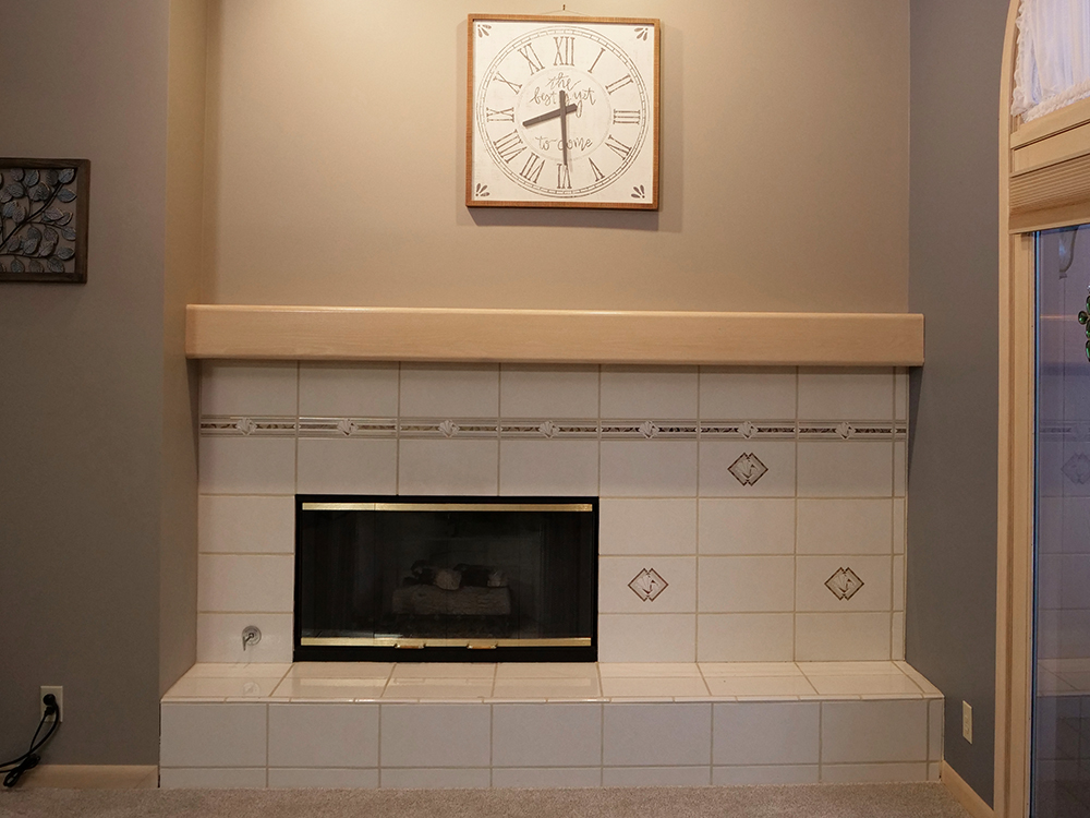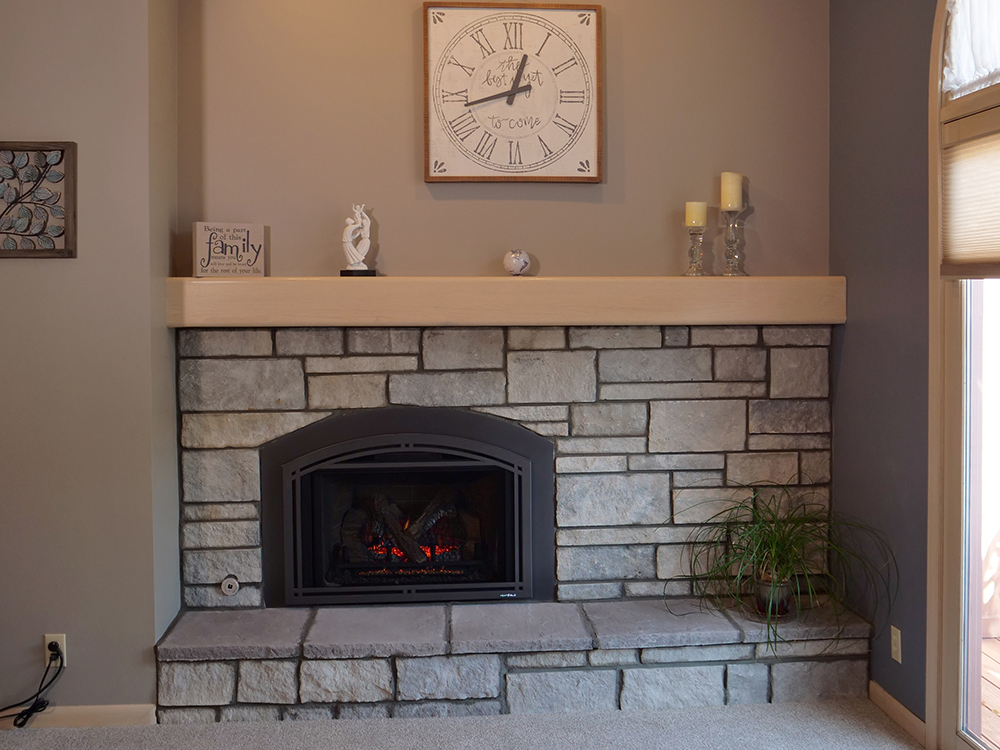 On this particular project, we went from an older fireplace unit to a Heat & Glo Escape 30 fireplace insert, which is complemented nicely by our U.S. Stone Courtland Dimensional with Cultured Stone Gray Hearthstones.