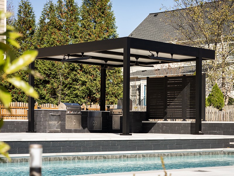 Our R-Blade™ pergola features a louvered top, allowing you to open and close them according to personal preference or the weather. Meanwhile, the R-Shade™ pergola has a fully closed top for permanent shade.