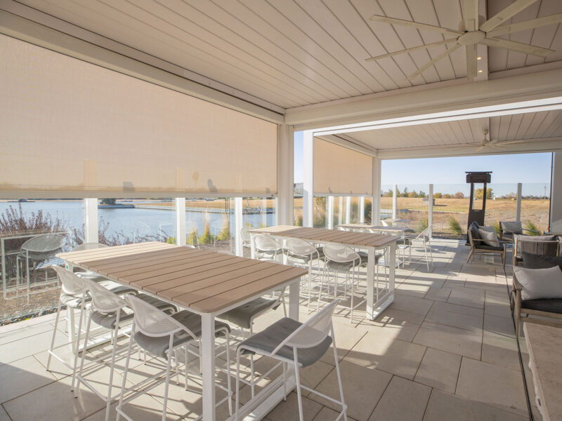 To elevate both style and functionality, our Progressive Screens were incorporated into the structure. These retractable screens provide shade and privacy without obstructing the stunning lake views. A built-in ceiling fan adds airflow and comfort, especially during warmer, windless afternoons. Add our built-in or free-standing patio heaters to take away the chill of early spring evenings.