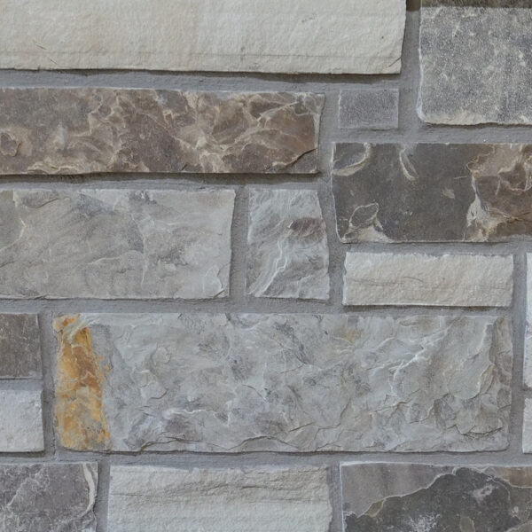 Our Antiquity Black Suede Straight Ledge stone features a beautiful blend of light and dark colors, primarily focusing on gray tones with a hint of browns.