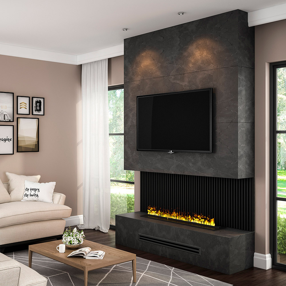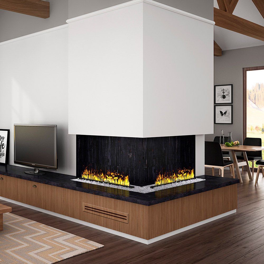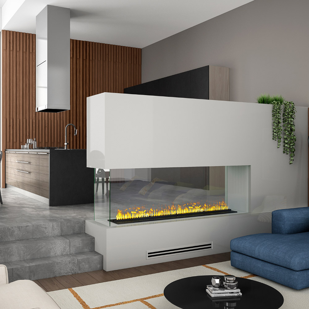 Picture the perfect fireplace: any length, any location, and any number of sides. Forget about venting, gas lines and hot glass, because they are a thing of the past. Now imagine flames made of water that you can reach out and touch. The revolutionary Opti-myst by Dimplex reinvents the electric fireplace and makes it easier than ever to add a dramatic fire feature to any space. See-through, three-sided, open concept, the possibilities are endless, so go ahead, play with fire.