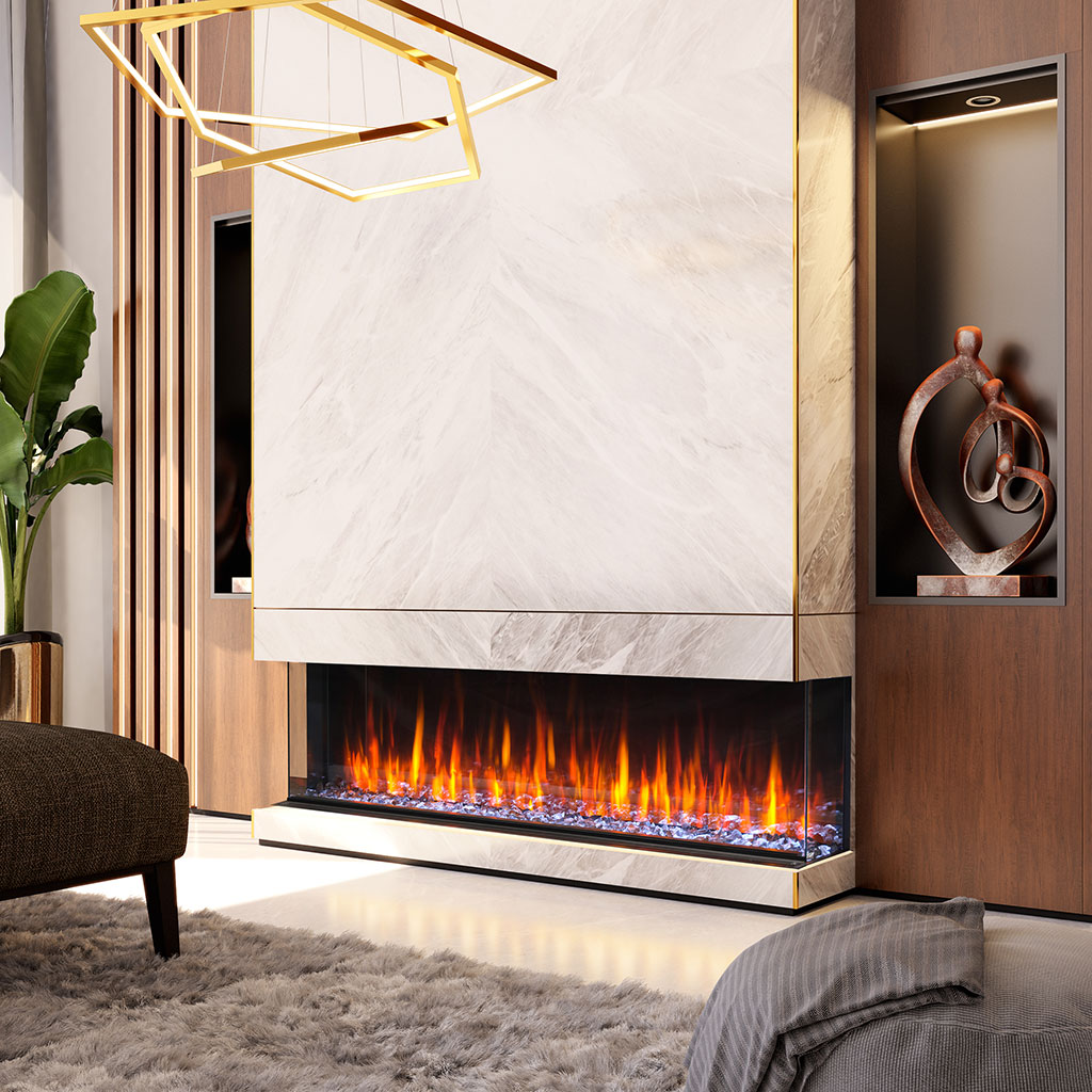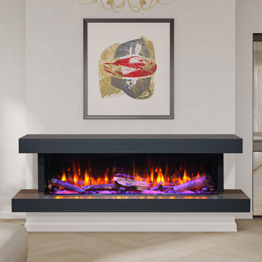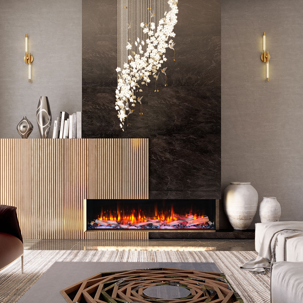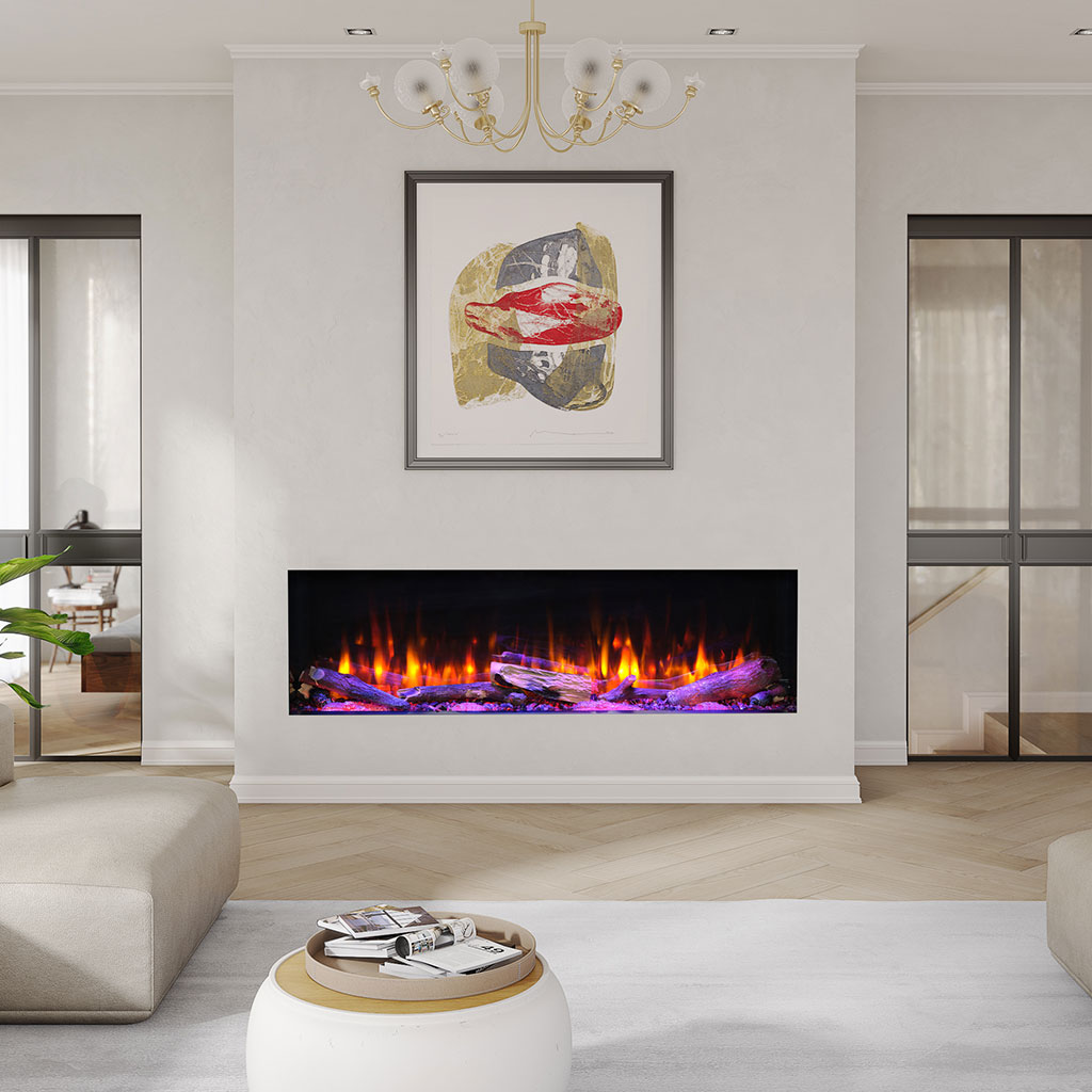 Our Kozy Heat Osseo eSeries electric linear fireplace comes in 3 sizes: 50, 64 and 80. The design options are nearly endless with convertible front facing, corner and panoramic bay options. Choose between a traditional or birch log set, 7 downlight accent options and 13 glowing ember options.