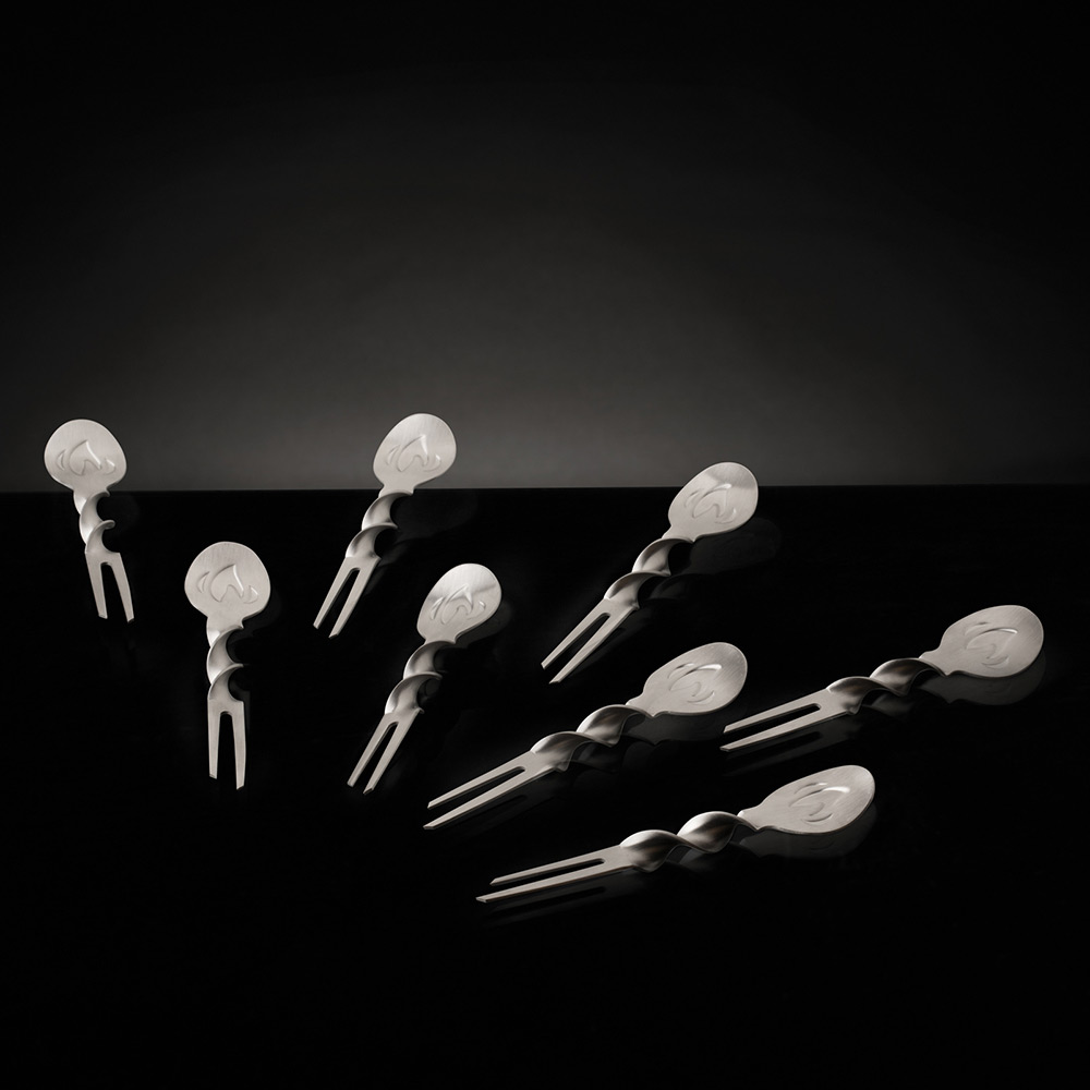 These elegantly formed, stainless steel forks will make your next wine and cheese night that much more exquisite. The prong ends are ideal for using as forks to pick up bites of cheese and meat, while the round end is the perfect size for serving caviar and pâté. These refined little tools are also ideal for serving freshly grilled corn on the cob too: preventing your fingers from being burnt and getting messy. Add the Napoleon Appetizer Serving Set and Corn Holders to your serving stockpile and add the perfect amount of functional elegance to your next dinner party or barbecue.
