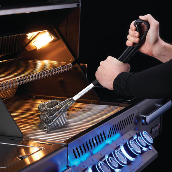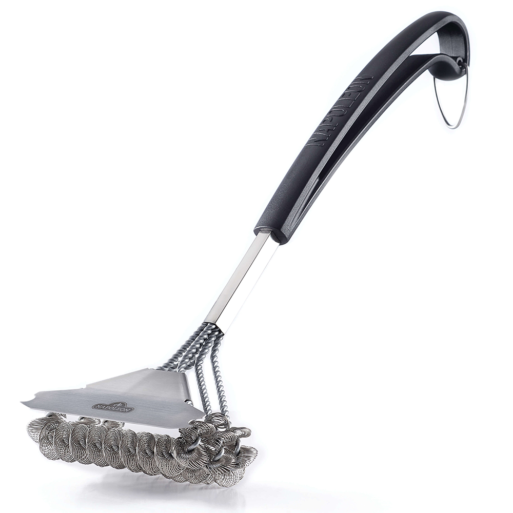 This Triple Row Bristle Free Grill Brush features rolled stainless steel for bristle free grid cleaning. Ideal for removing stuck-on residue from stainless steel cooking grids. The curved handle design provides added leverage while cleaning, and the extra-wide grid scraper helps to power off particularly stubborn spots. The convenient hook means this grill brush is always within reach.