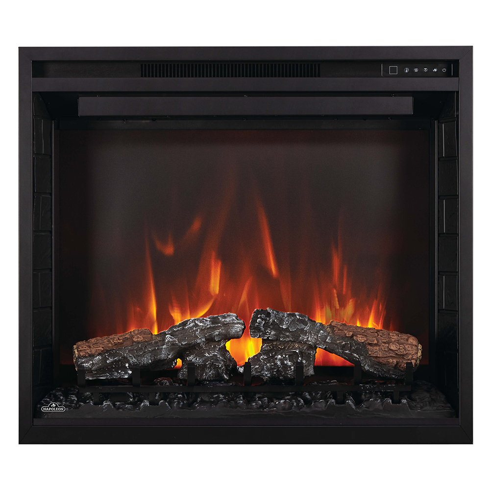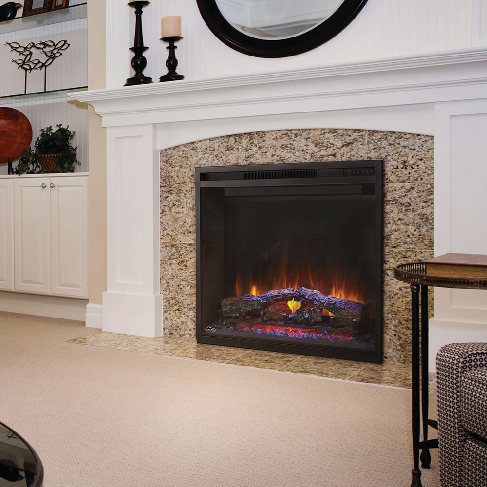 With the highest heat output and best looking flame in it’s category for Napoleon, the dual voltage options allow a plug and play or hardwire installation with 120/240V. Offering so much, from the impressive flame pattern, the glowing log set with ember bed and the addition of a top light in 7 different color settings, it is as sure to impress.