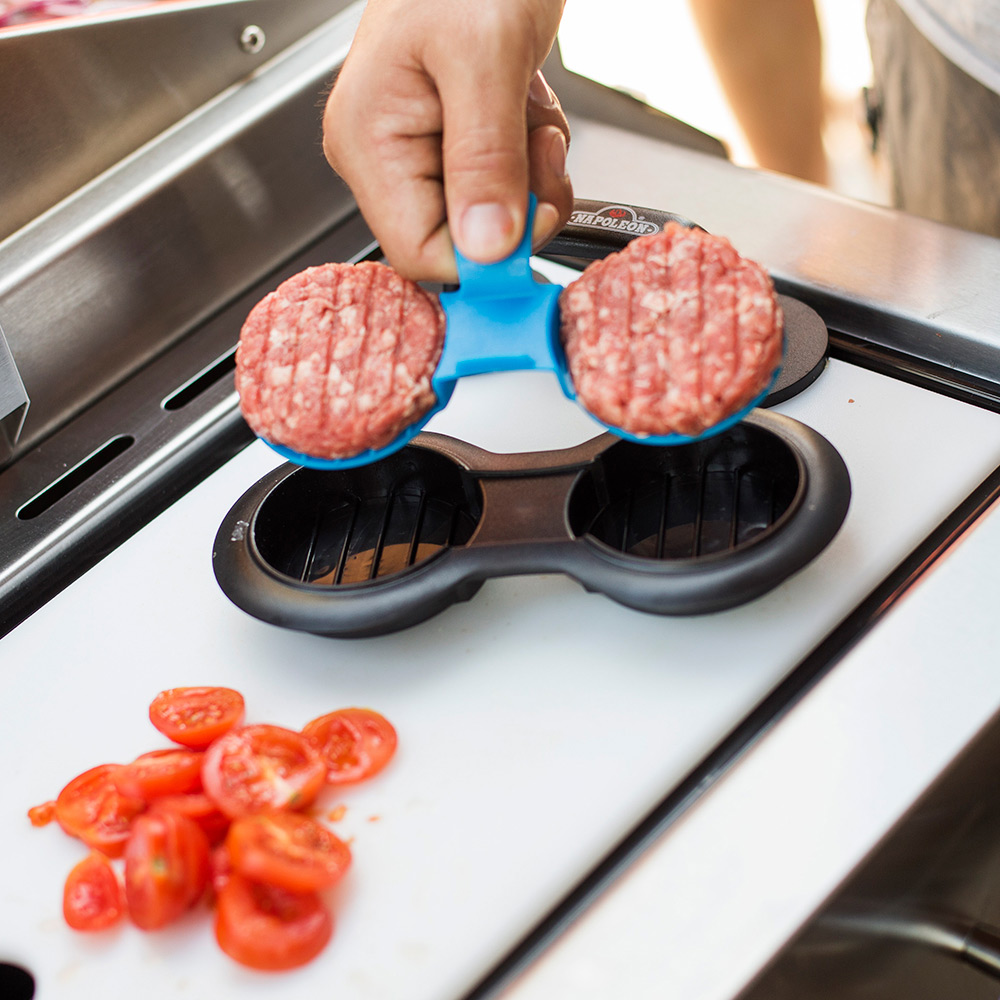 Having trouble keeping your hamburgers and sliders looking like they should? The Napoleon Gourmet Burger Press Kit is perfect for you. Easily form perfectly round burgers in the full sized burger press. The nonstick surface and removable bottom plate allows you to easily extract them. The cover comes off the handle to reveal a smaller press so that you can make stuffed burgers too, perfectly sealing in your favorite fillings. The slider press is just as fantastic, and you can form two perfectly proportioned sliders at once, and the bottom plate has a handy little hook to lift them out. Try Napoleon’s Gourmet Burger Press Kit today and enjoy restaurant style gourmet burgers today.