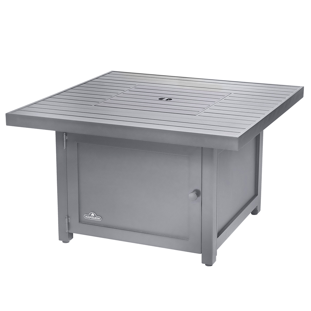 The beautifully constructed, durable, aluminum surround conveniently hides a gas tank (propane models). Never worry about the weather, drainage holes in the burner pan allow the rain to drain away, and the optional windscreen will protect the flames from the wind. Set your drinks down, converse in comfort and enjoy your outdoor living space. Easily convert your Hamptons Series Square Patioflame Table into a fully functioning table with the included matching cover.