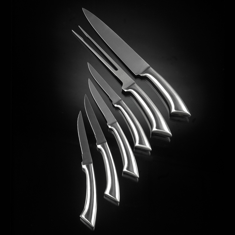 All of the pieces are a seamless, single piece, which means that there will be no loose handles and they definitely won’t fall apart when washed. Each piece in this Professional Knife Set is perfectly balanced, meaning, when you hold the knives they feel good in your hand. The handles sport a smooth, rounded, ambi-ergo feel. They’re perfect if you are right or left-handed. All of the knives in this set are sharpened and ready for immediate use. So pick one up and use it on your latest culinary creation.