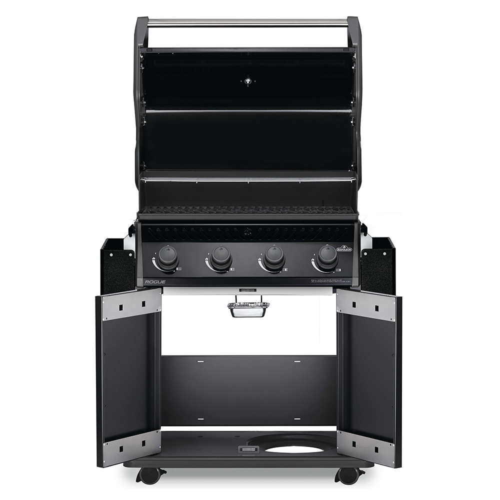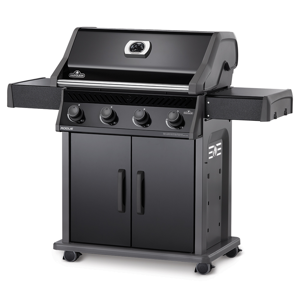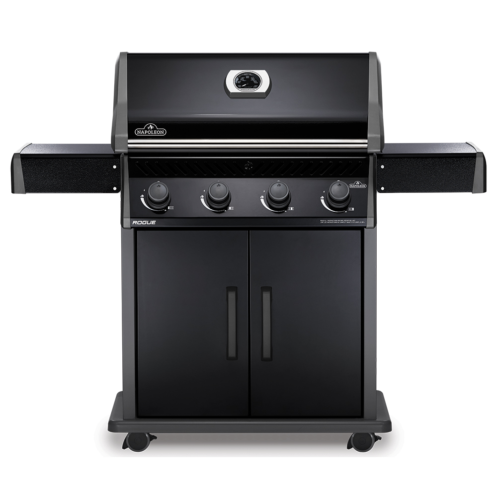 Napoleon’s Rogue 525 Propane Gas Grill is a large, premium quality grill with an affordable price. Four burners light instantly with a battery-free ignition. This grill features precise temperature control and high heat searing over cast-iron cooking grids. The stylish black exterior is highly durable and easy to clean.