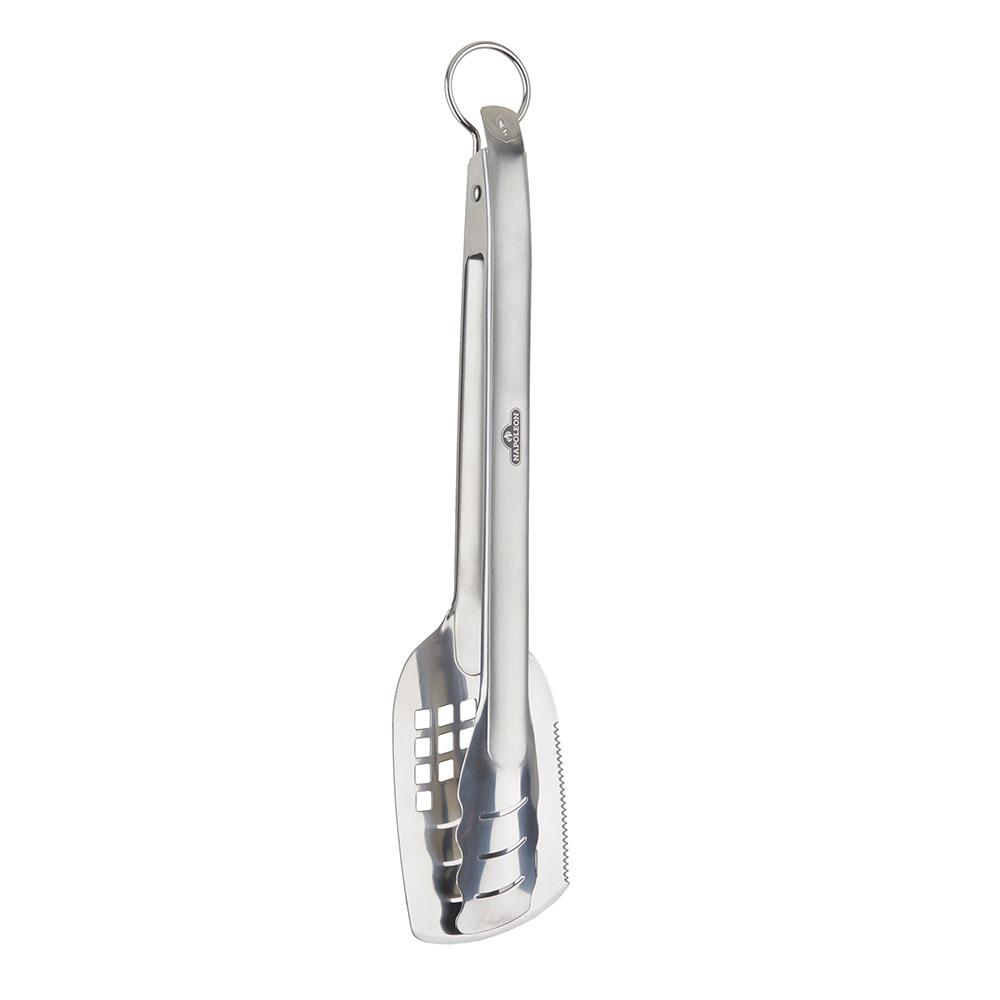 Use the tongs to stabilize things like fish or that gigantic steak when flipping for the perfect sear. The spring-loaded mechanism provides stability and control, while the easy to use locking handle provides great, compact storage, and a convenient tool hanger.