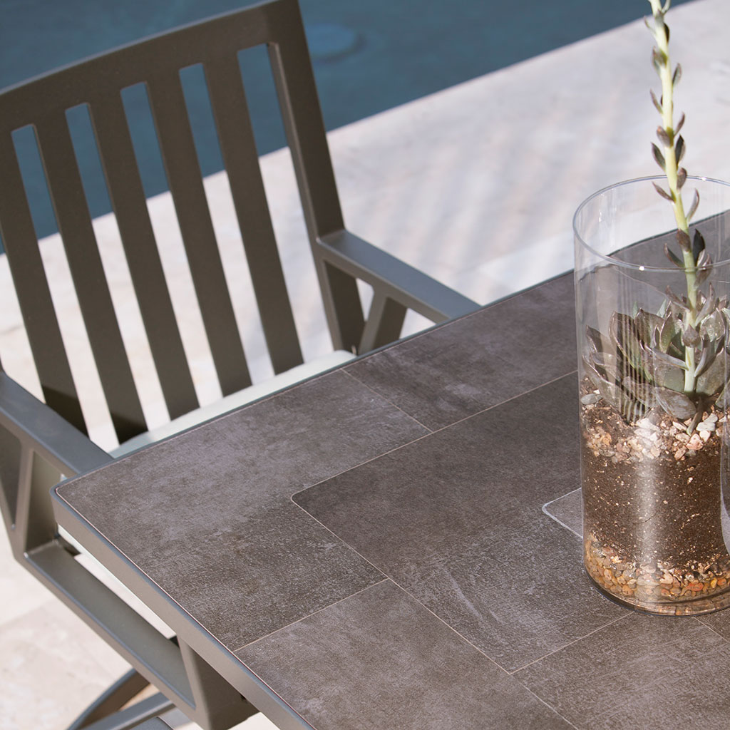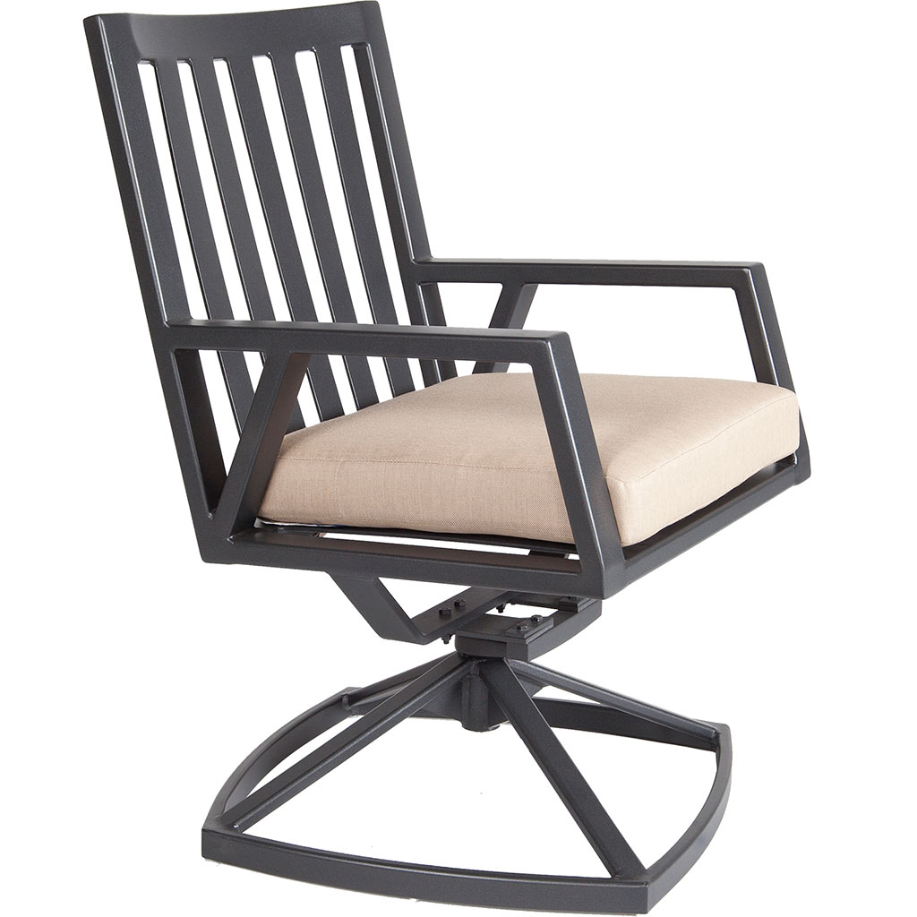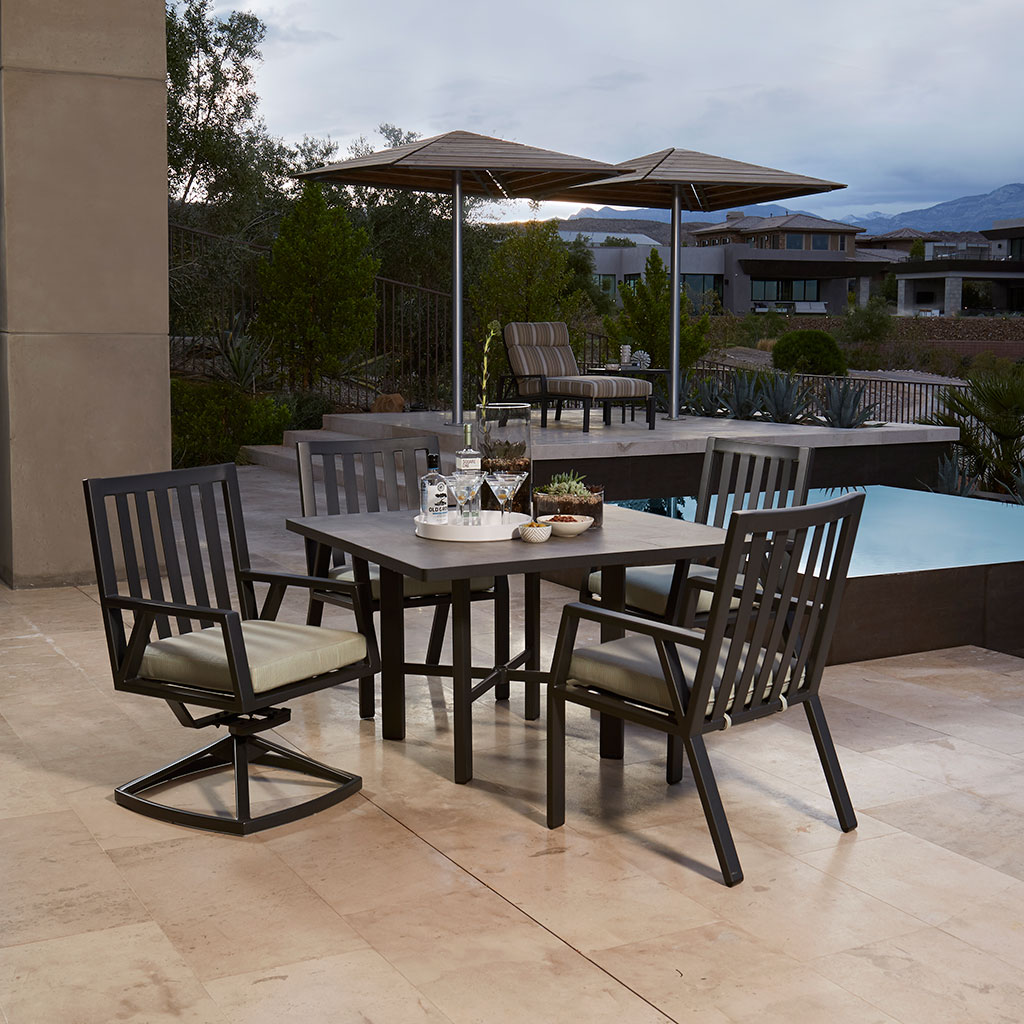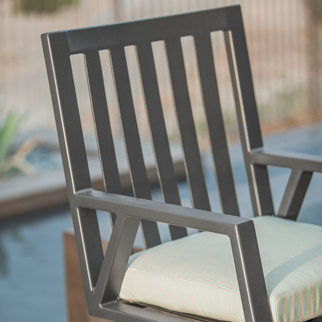 This Aris dining set is available with various seating options, including but not limited to dining arm chairs, swivel rocker chairs, backless bar stools and mote. Pair it with a luxurious OW Lee table with a mesh or porcelain tiled top (or a luxurious fire pit table to keep you warm) and you’ll be ready to dine outdoors all season long.