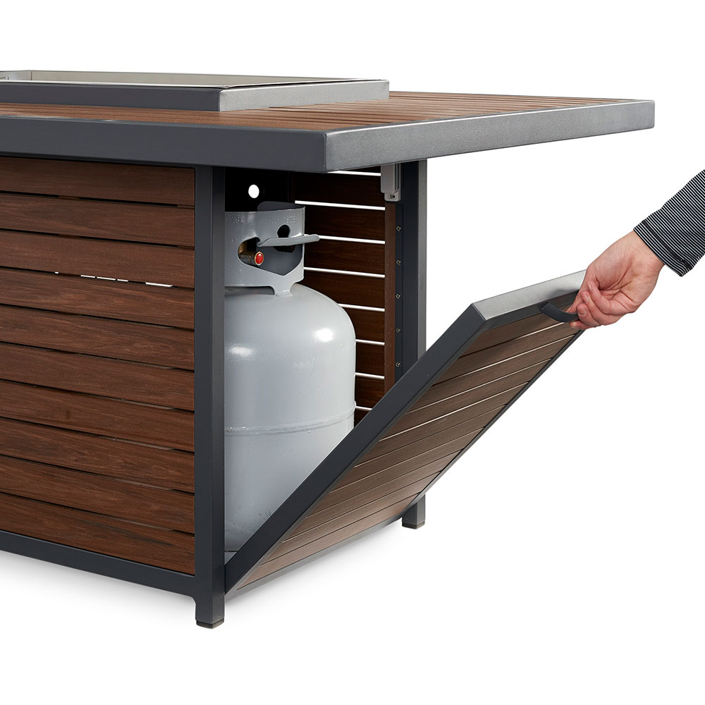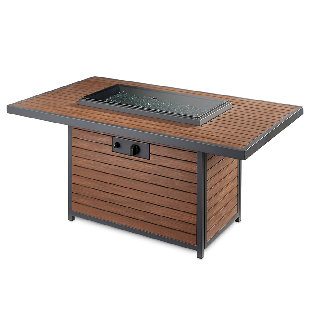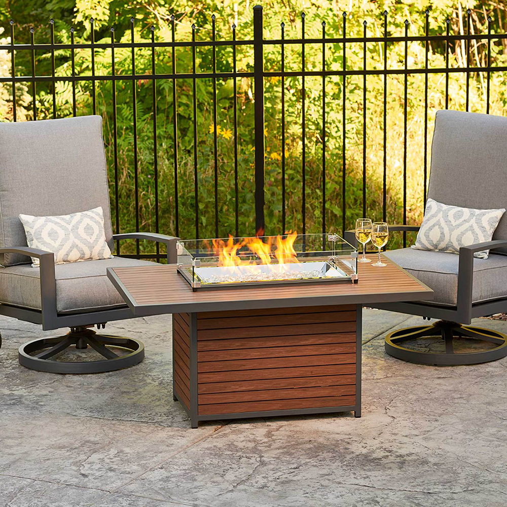 The easy to care for composite deck top and base brings a modern, but warm look to your outdoor room. The unique elevated 12×24″ Crystal Fire™ Burner is UL listed for safety and will wow your guests.