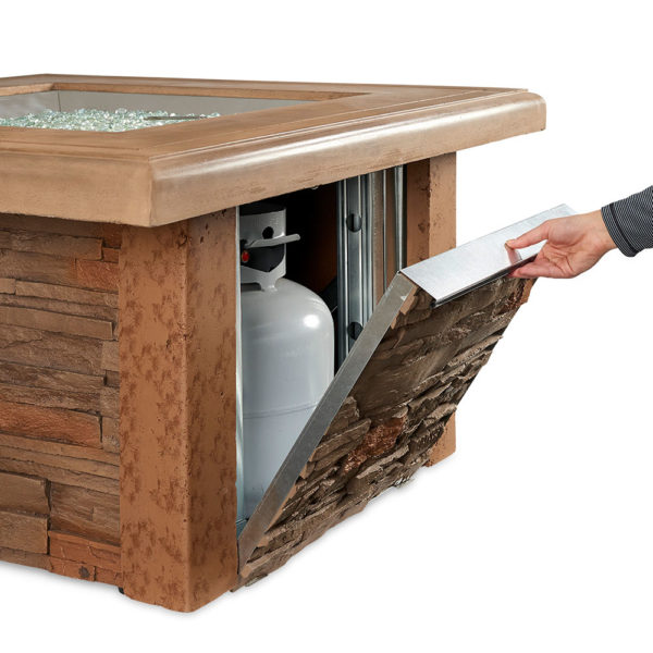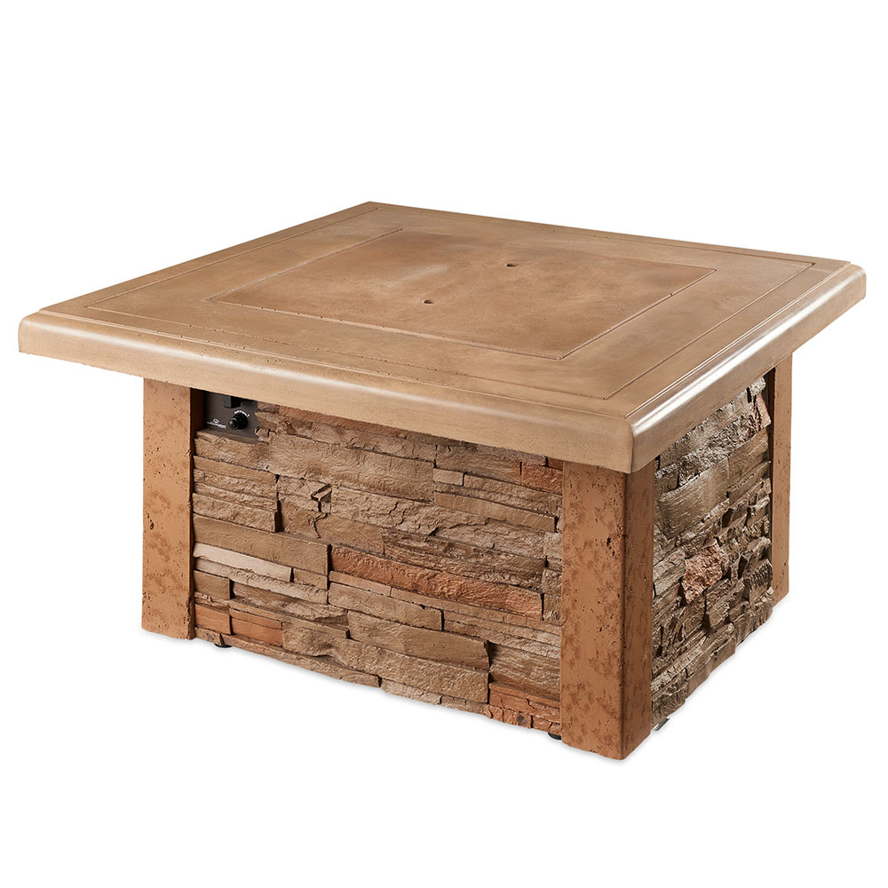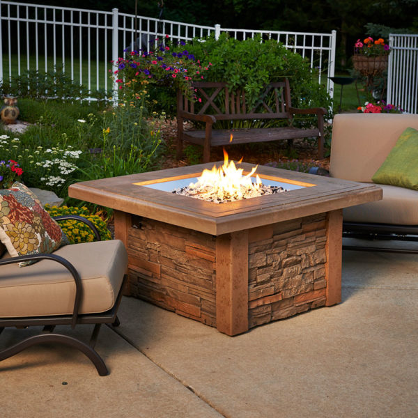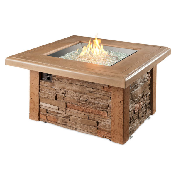 The Sierra Square Gas Fire Pit Table is made with outdoor rated faux stone and durable Supercast concrete. The durable Supercast top looks great and stands up to the outdoor elements. 24×24″ Stainless Steel Crystal Fire Burner.